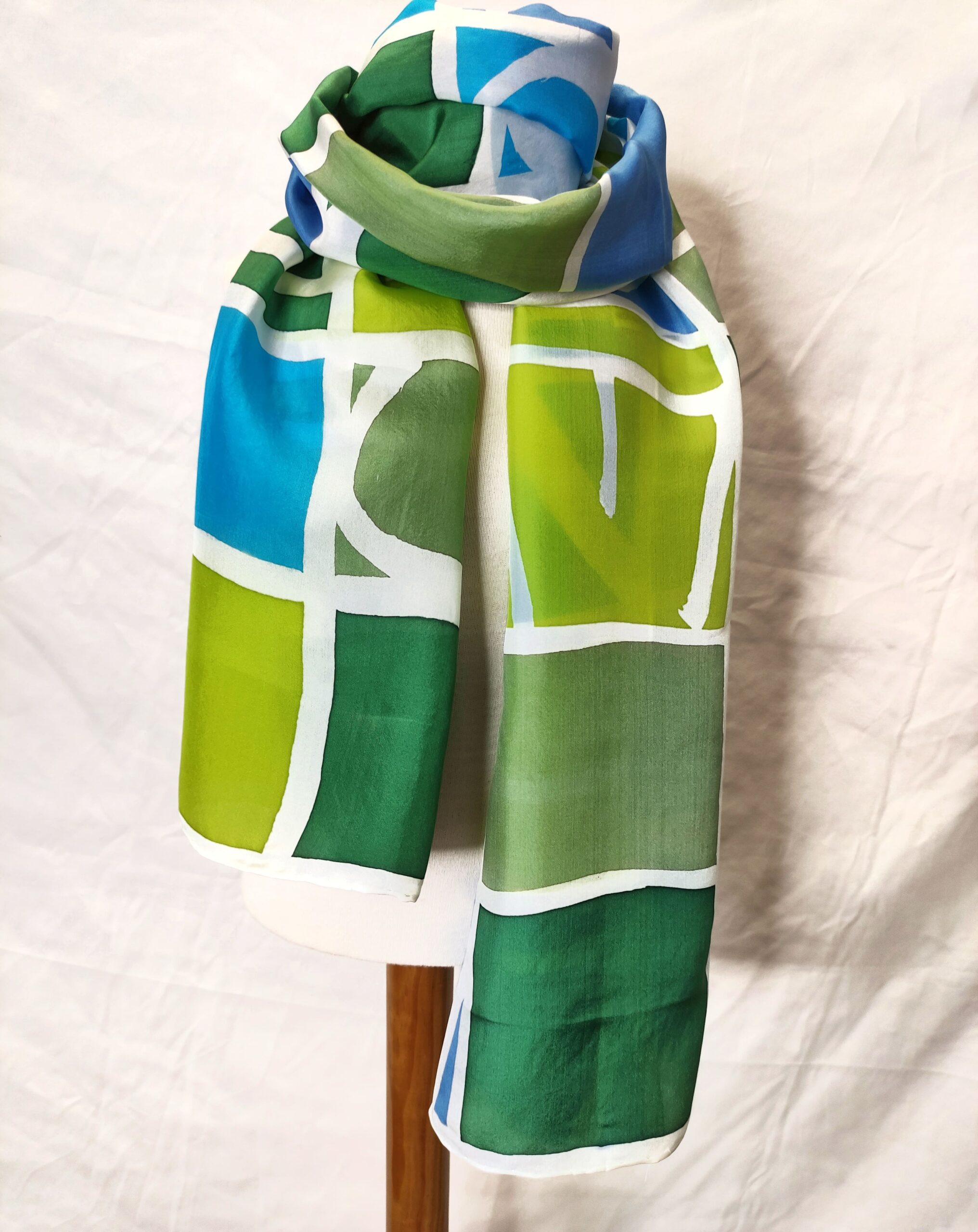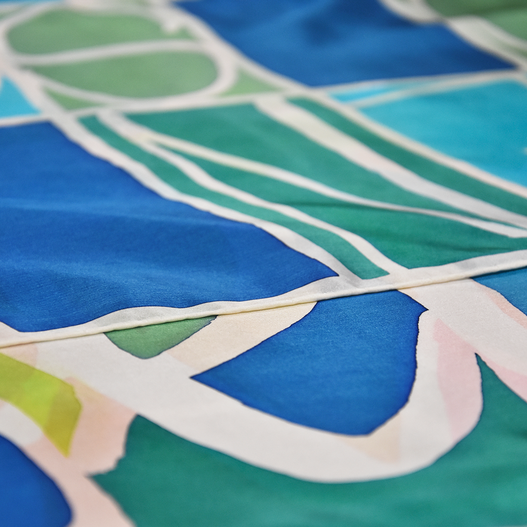 Utilizo tintes H.Dupont para pintura sobre seda y lana, fibras de origen animal, que son fijados a través de un proceso de vaporización con lo que se consigue que no haya diferencias de tonalidad entre las dos caras del tejido.