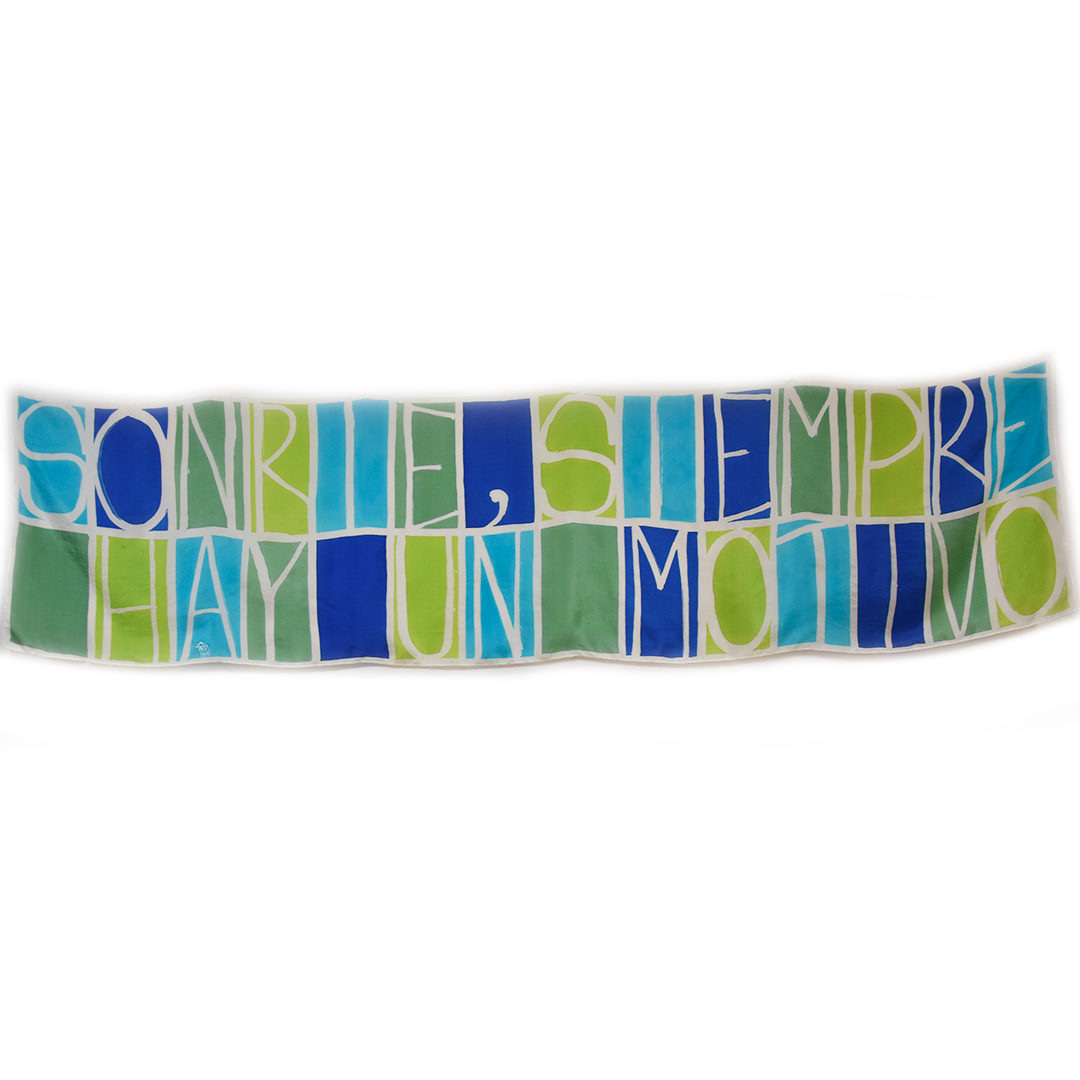 Este fular de seda con el mensaje “Sonríe, siempre hay un motivo”, un mensaje de amor que te ofrezco en tono verde, lo puedo pintar en otros colores elegidos por ti en un plazo de 3-4 semanas.